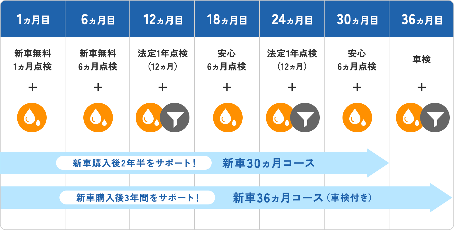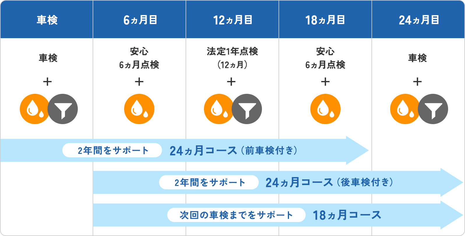 - ※エンジンオイルは各点検時に交換します。オイルフィルターは法定12ヵ月点検と車検整備時に交換します。